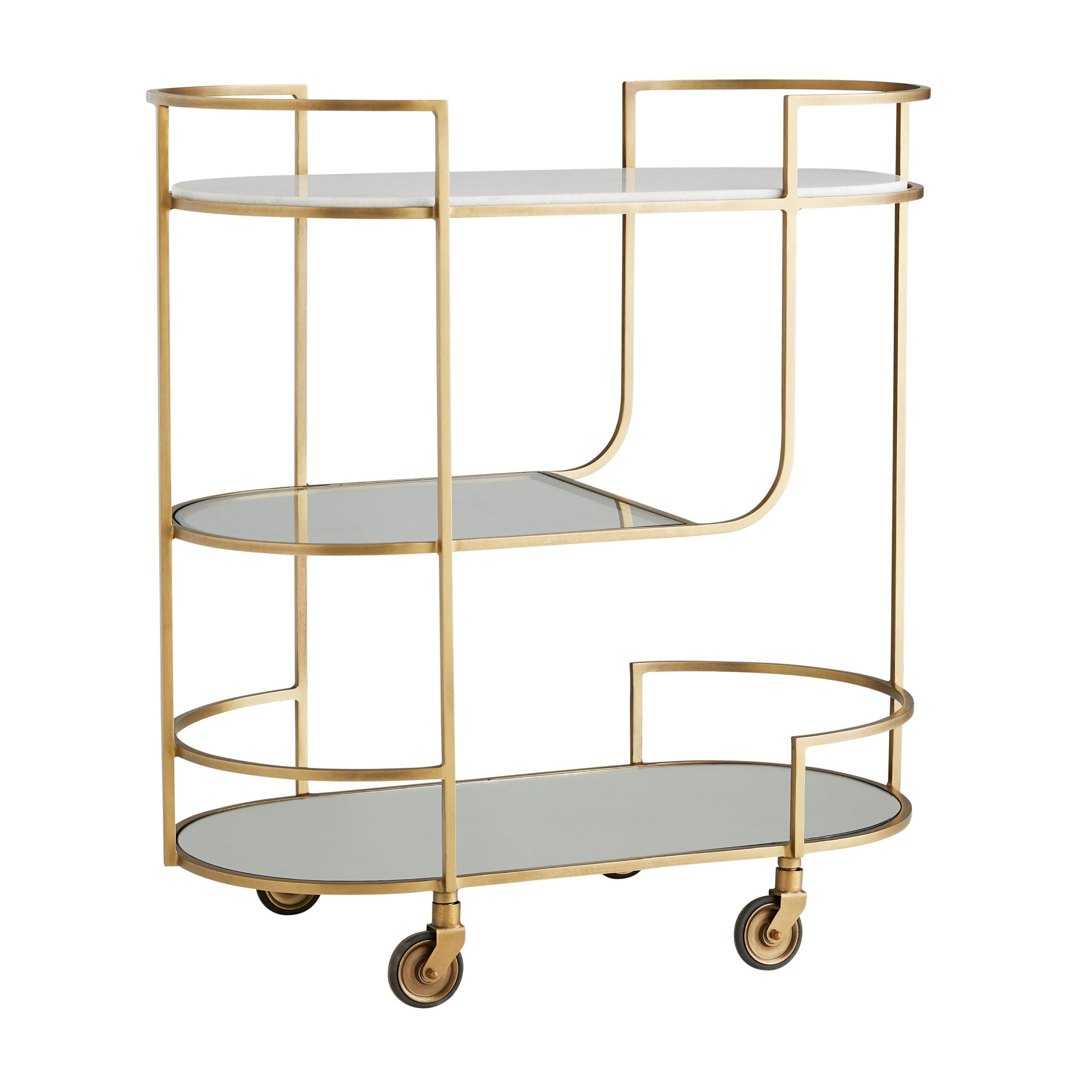Serve your guests without forfeiting function or style. Crafted with an iron frame in an antique brass finish, each of the three tiers of this capsule-shaped bar cart features a different element. The top tier is inset with solid white marble, the second tier is inset with clear glass and the third tier is inset with mirrored glass. The use of mixed materials delivers a luxe visual appeal. Finish will vary