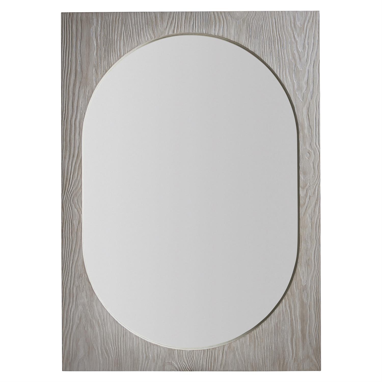 A rectangular wood frame surrounds an oval shaped reflective surface in the Trianon mirror. Showcased in the Gris finish, the simplified modern mirror is a study in geometry and balance.