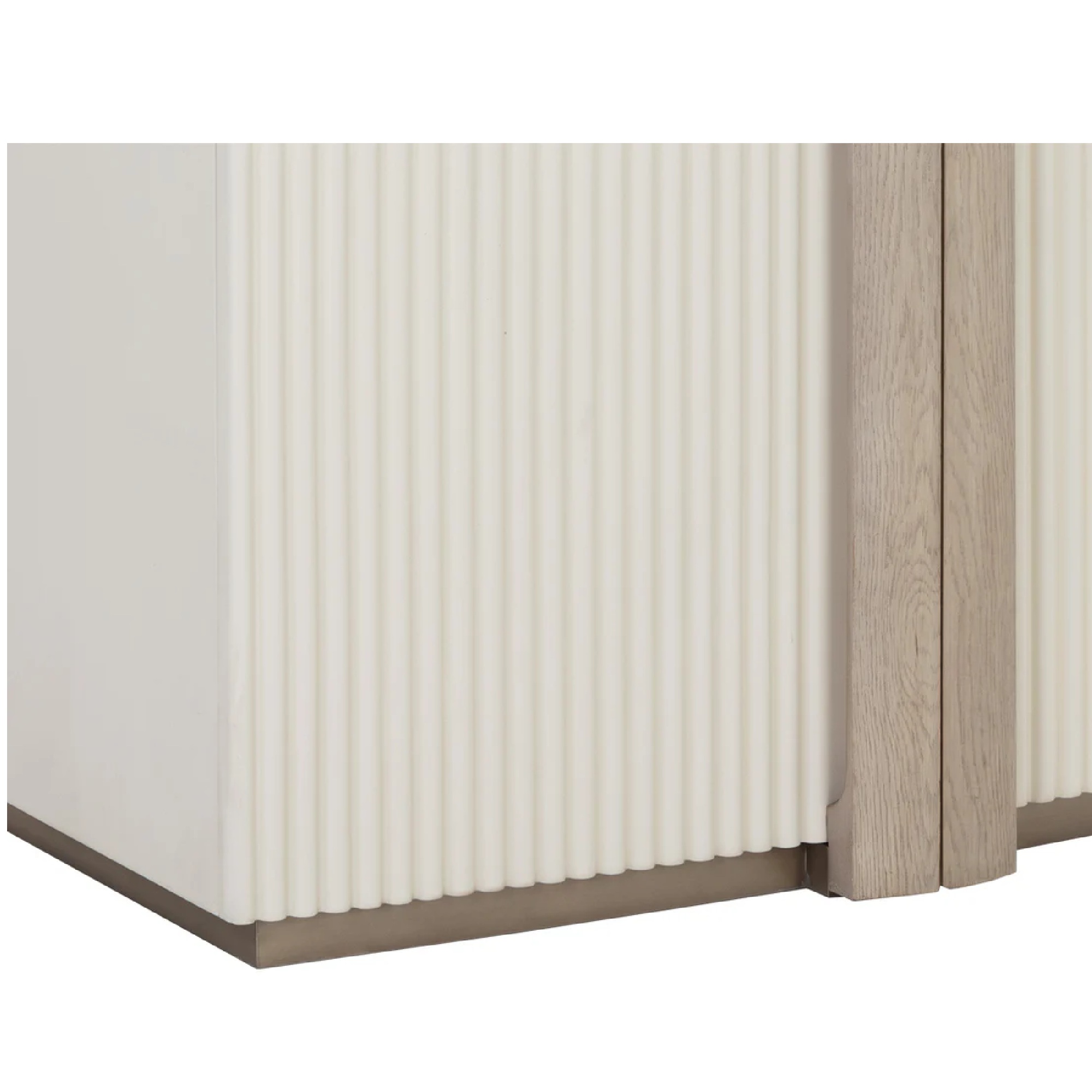 Spacious and stylish, the Venetta Sideboard will elevate any space. Smooth light oak wood handles beautifully complement the cream base and reeded front doors. As wood is an organic, porous material, these pieces will contain natural variation of texture and may also exhibit fine indentations and cracks. Wood pieces will also display a disparity of colour and grain, and visible knots and burls that add to the character of each piece.
