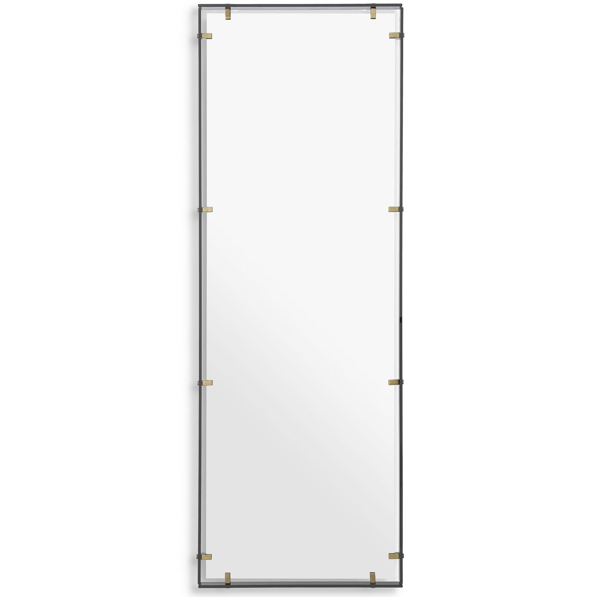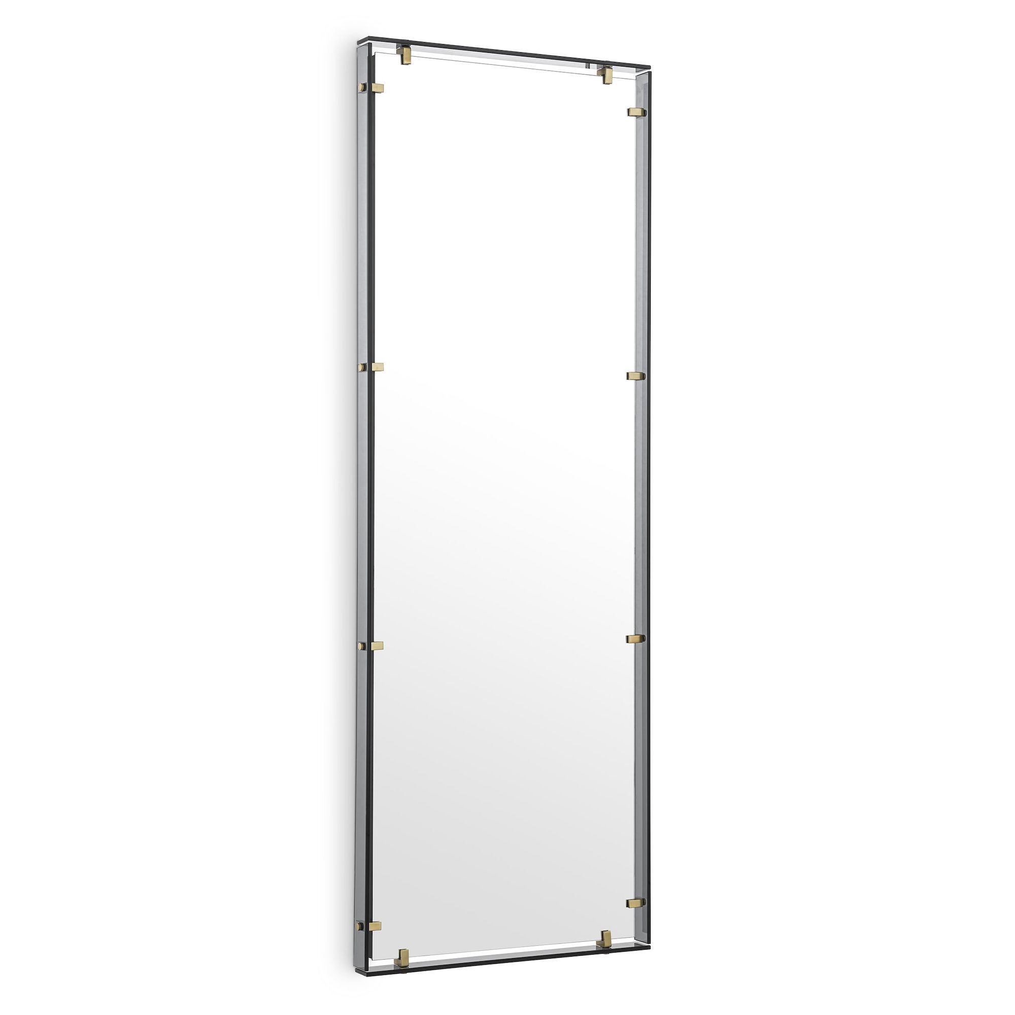 Sleek and sophisticated, the Verona Mirror exemplifies contemporary style with a silhouette made of mixed materials arranged into a distinctive form. The rectangular smoked glass frame features antique brass accents that gleam in the soft light as they extend from the frame to uphold the mirror.