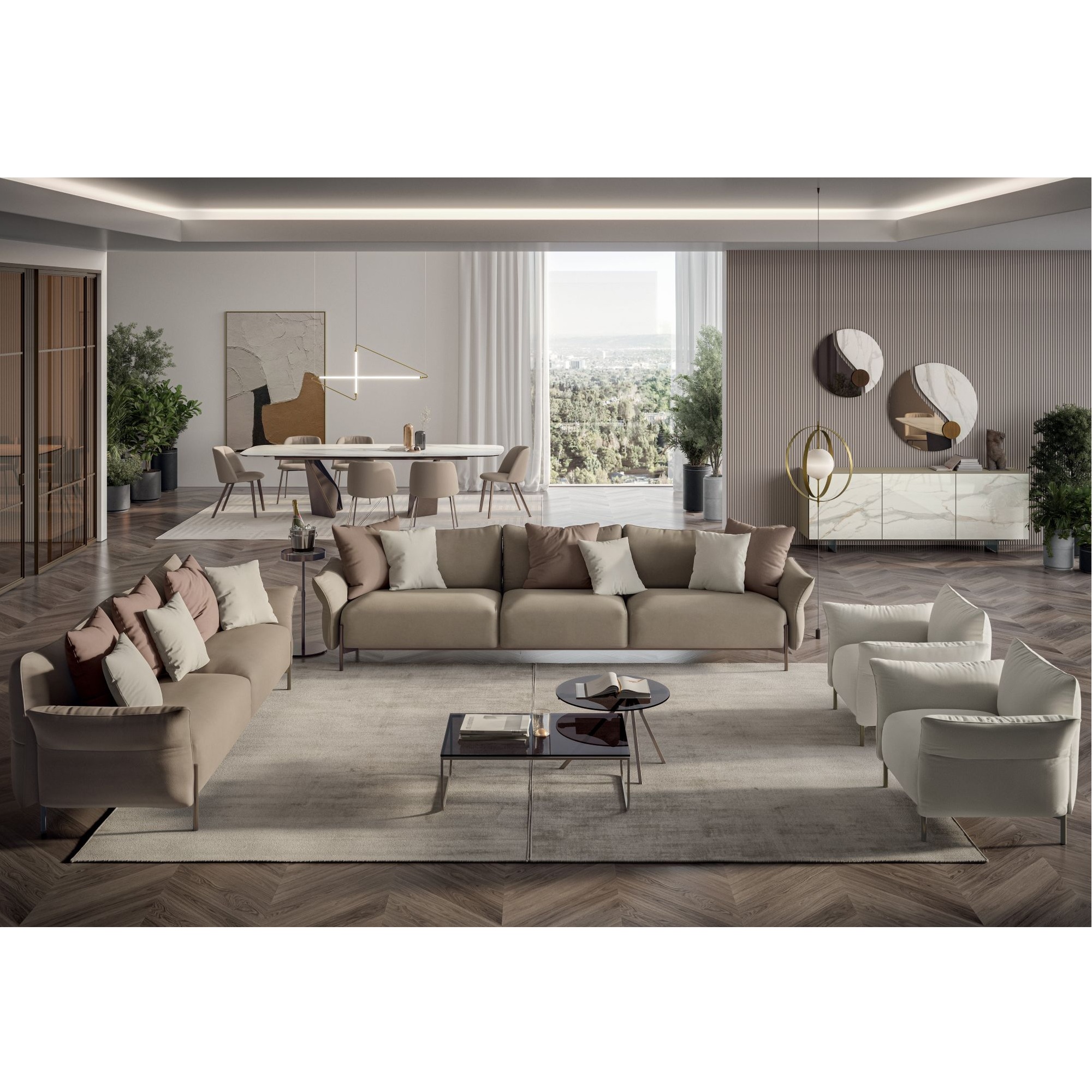 Available in various fabrics or leathers with metal feet in various lacquered finishes. Composed of modular units for different configurations.
