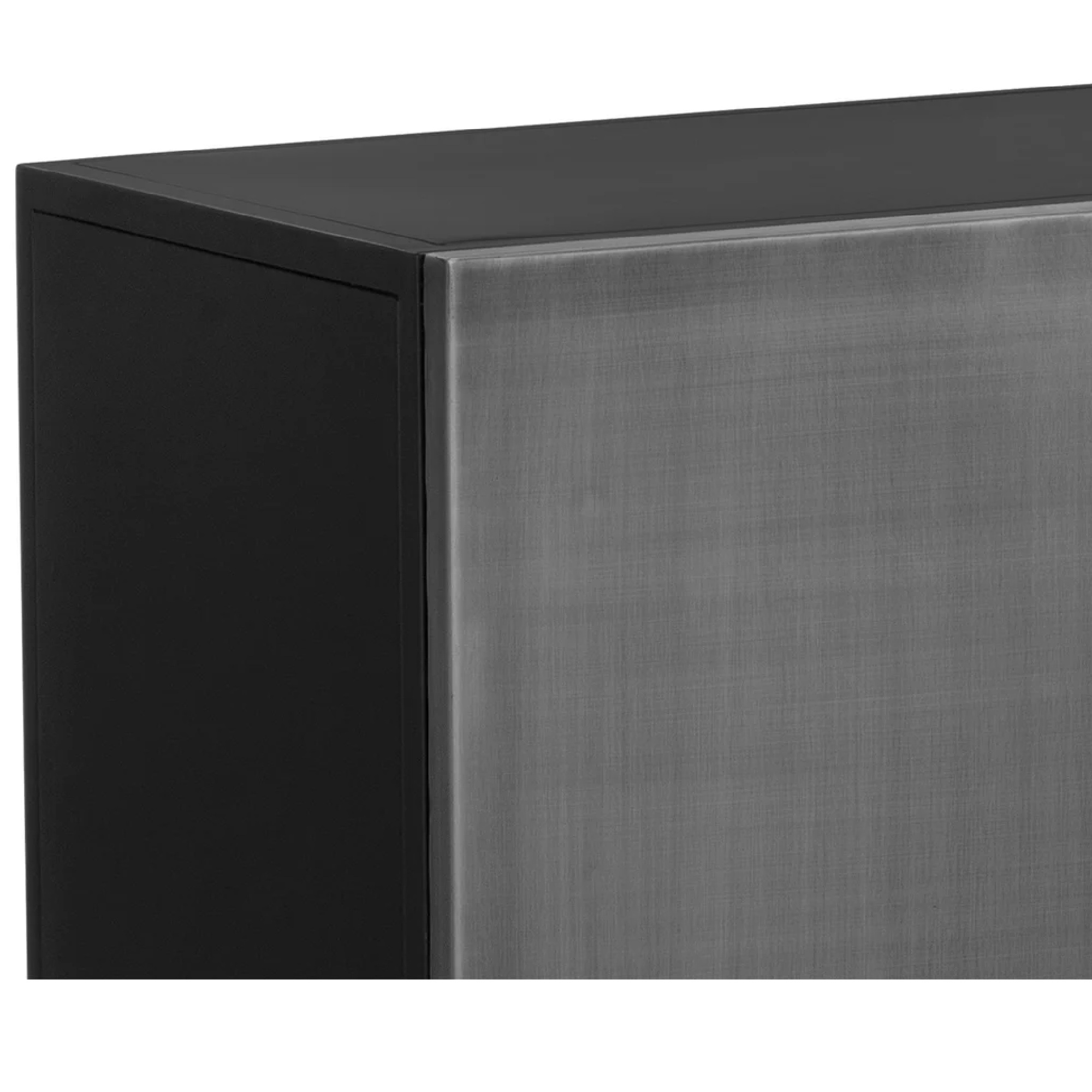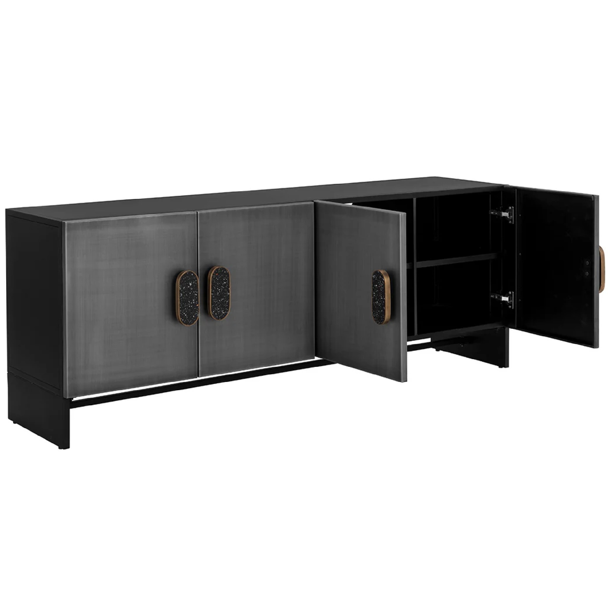 Add a cool and moody atmosphere to your dining space with the Viserys Sideboard. Features a black powder-coated frame and black terrazzo marble handles. Antique zinc iron doors add a faded lived in look to the piece. Made in India. With refined craftsmanship, this design was brought to life by skilled local artisans. Due to the nature of handcraftsmanship, unique imperfections such as fissures, markings and variations in colour and shape are welcomed and appreciated characteristics for a truly one-of-a-kind piece