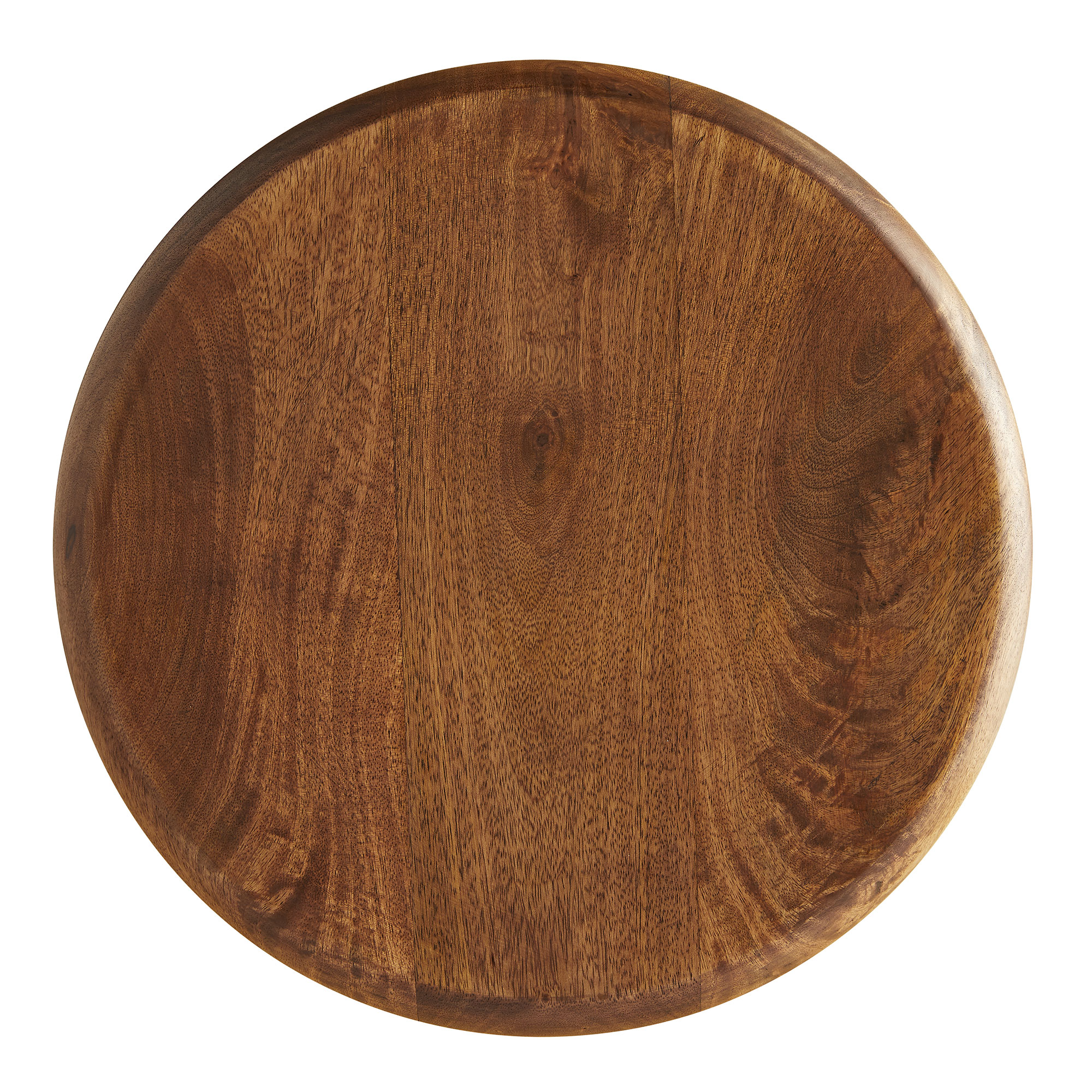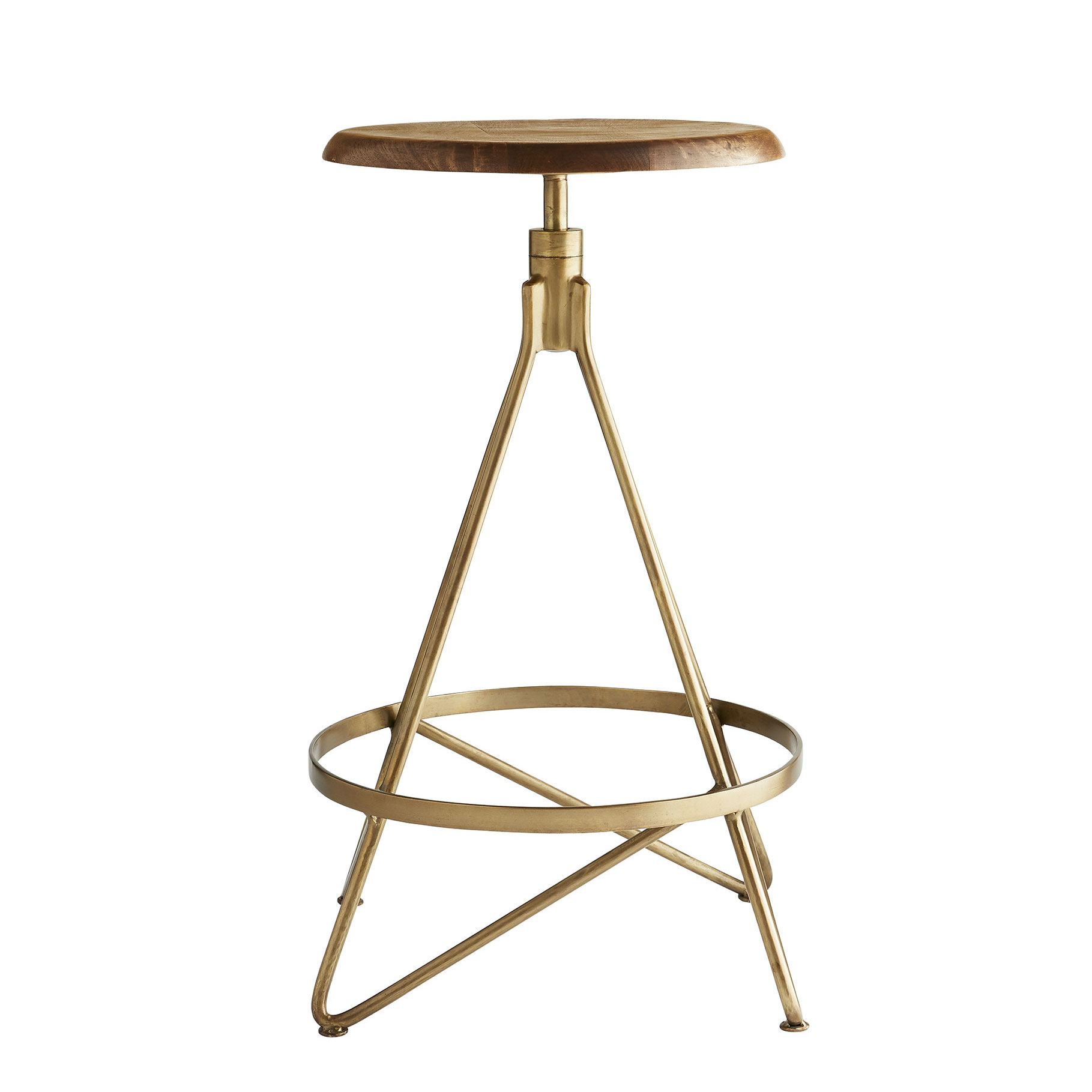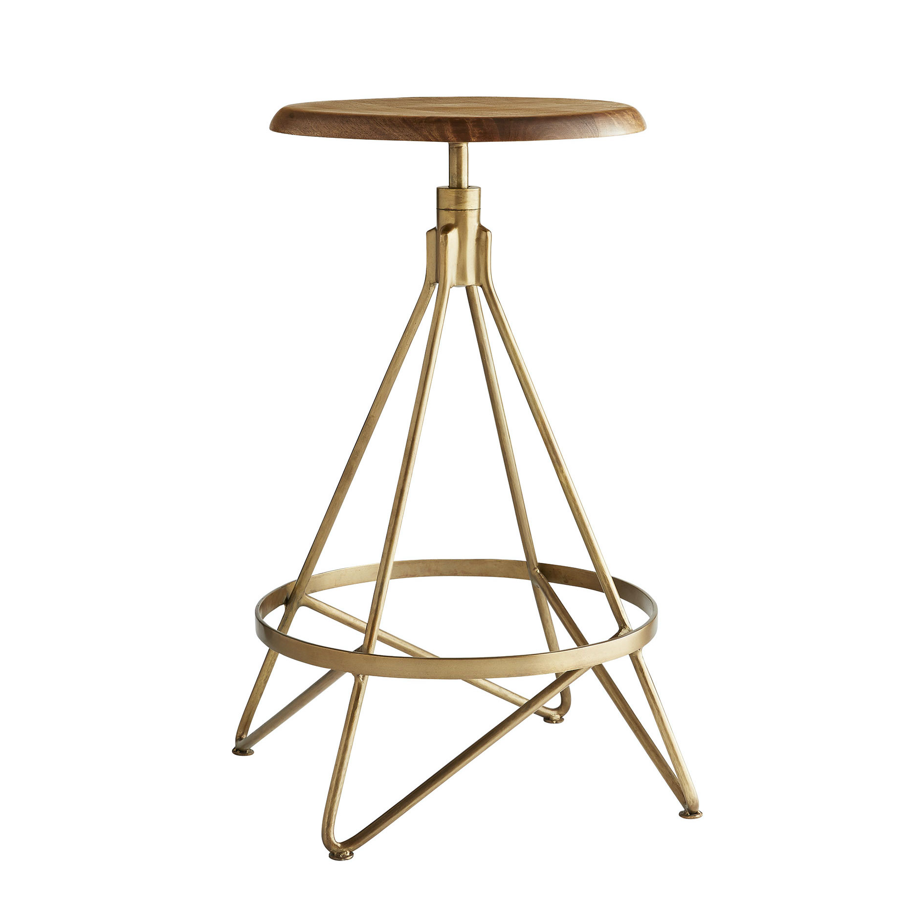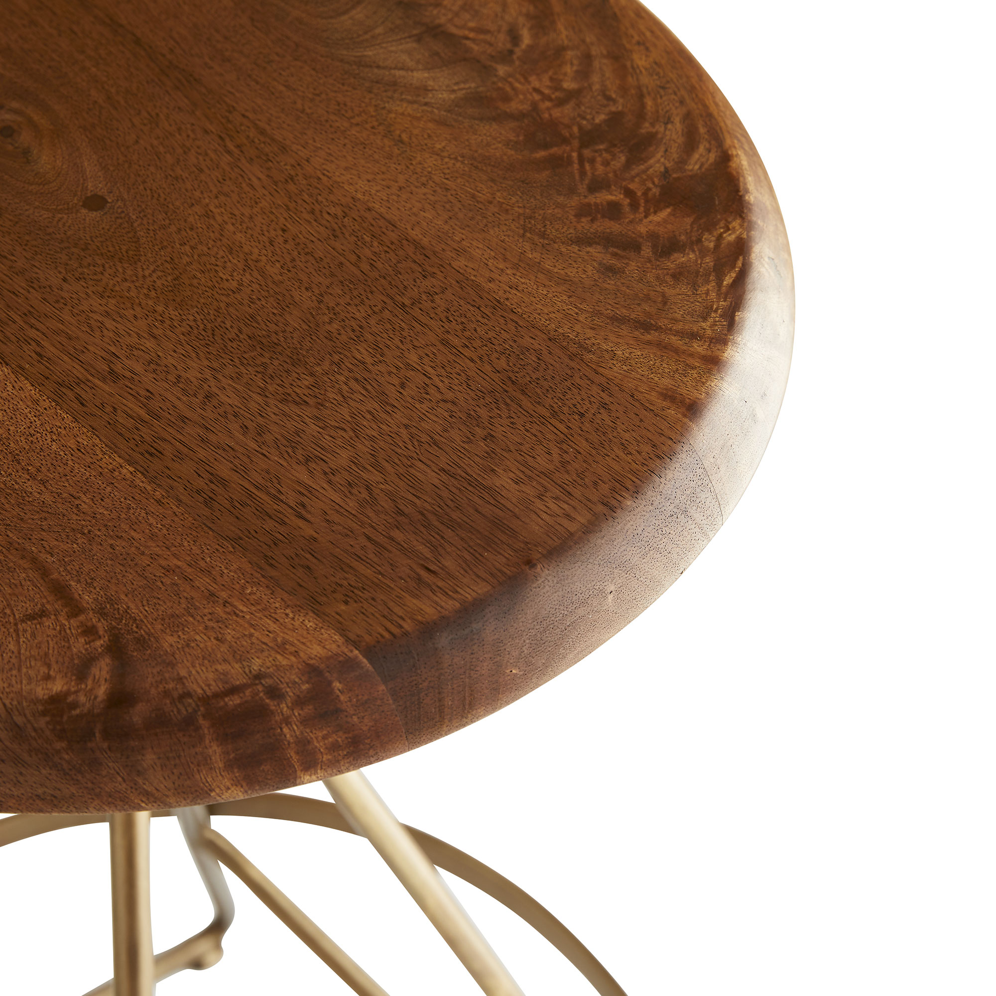 Counter stool with tube shaped triangular iron legs in vintage brass fin- ish with round wooden swivel seat in distressed wax finish.